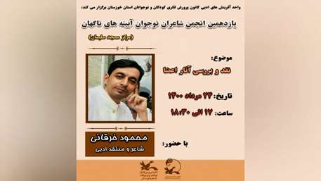یازدهمین نشست مجازی انجمن شاعران نوجوان آیینه‌های ناگهان کانون پرورش فکری کودکان و نوجوانان مسجدسلیمان ساعت ۱۷ الی ۱۸:۳۰ روز یک‌شنبه ۲۴ مردادماه ۱۴۰۰ برگزار می‌شود.